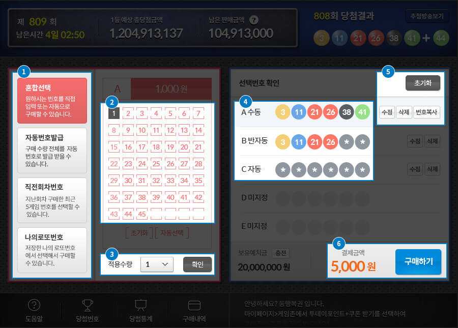 | (1) 6개의 번호를 모두 또는 부분적으로 선택할 수 있는 혼합, 시스템 자동발급, 직전회차 번호 재선택, 저장한 로또번호 중에서 선택할 수 있습니다. |