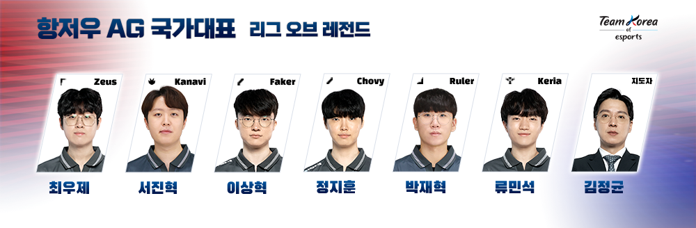 우리나라 리그오브레전드 국가대표 선수단은 '제우스' 최우제, '카나비' 서진혁, '페이커'이상혁, '쵸비'정지훈, '룰러'박재혁, '케리아'류민석 선수 6인과 김정균 감독이 메달에 도전합니다.